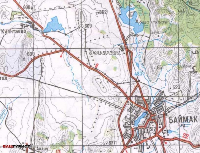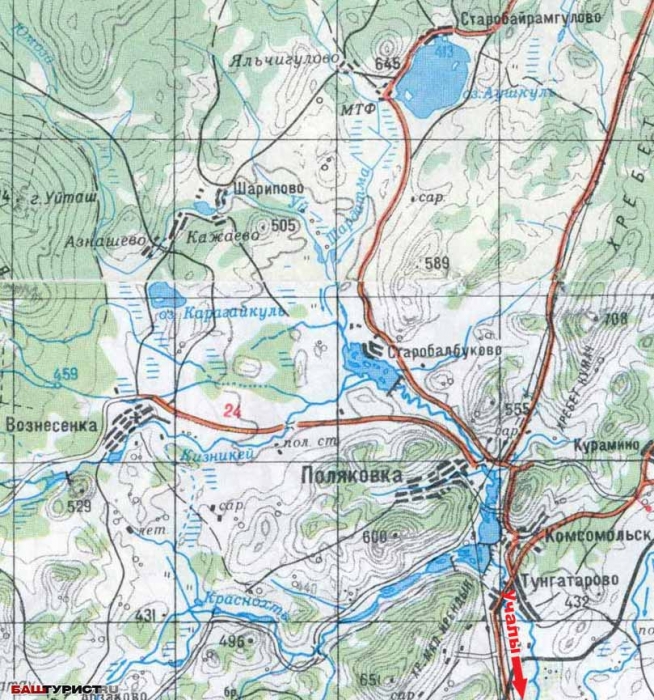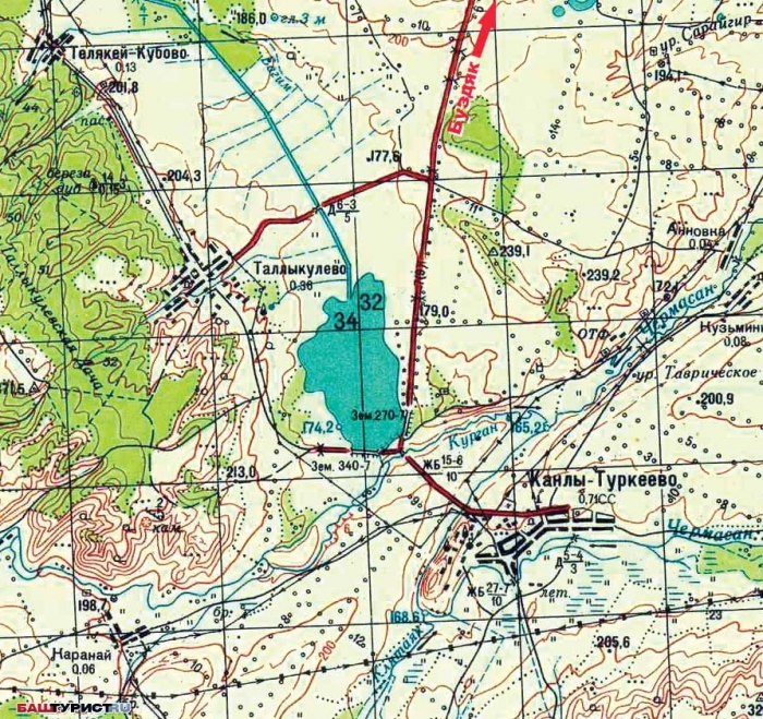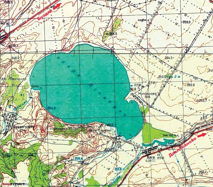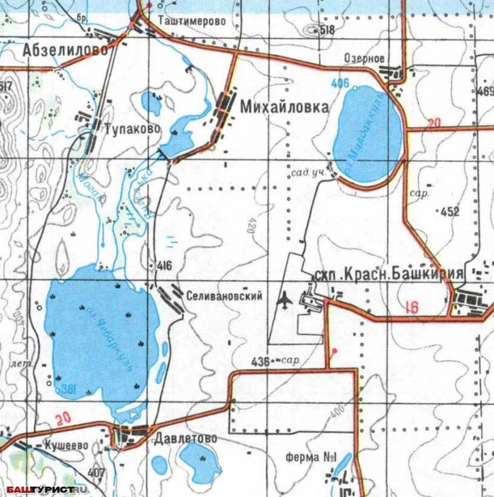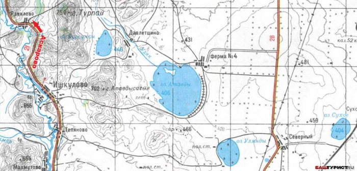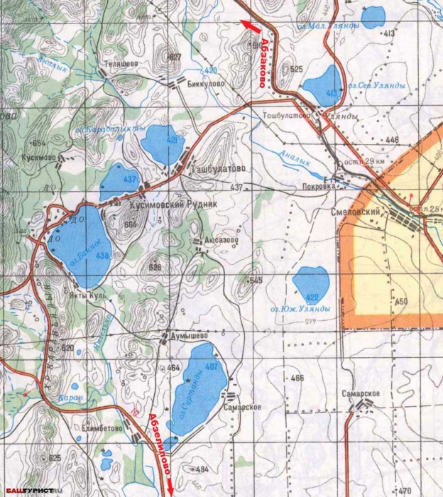 Озеро Атавды, Улянды и Сухое в масштабе 1:200000. Абзелиловский район
