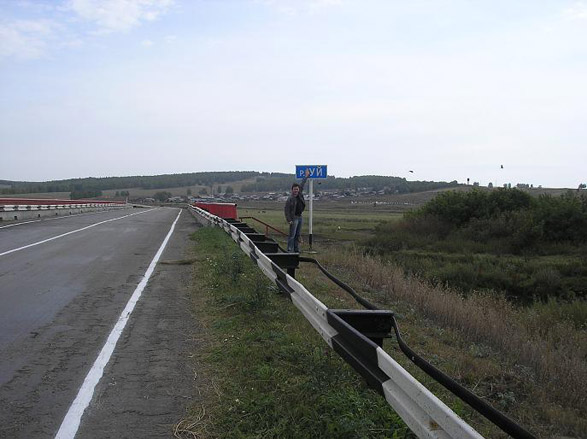 Пока я фотографировался на фоне таблички, показался Жека, обогнал меня, да так удачно…После въезда в Уйское он не сбавил скорость, за что и был остановлен местными гайцами. Вот уж воистину, всему свое время, трассе – быстрая езда, а населенному пункту – медленная.