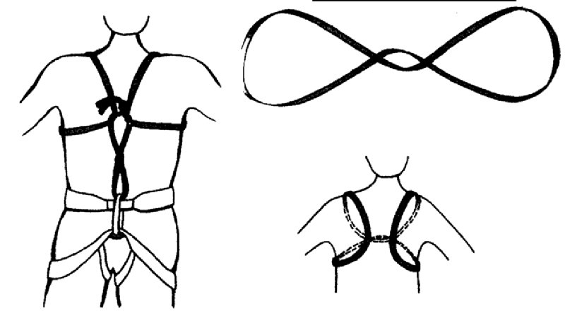 С помощью длинной стандартной петли (120 см) можно быстро и довольно удачно смастерить замену стандартной грудной обвязке. Петля проворачивается два раза, и получившаяся комбинация одевается на плечи. Двойной проворот более удобен поскольку практически не ползёт.