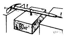 Рис. 3. Проверка прочности рукоятки ледоруба: 1 – головка; 2 – рукоятка; 3 – штычок.Очень практичным дополнит. средством является лопатка из легкого металла (напр., из титанового сплава), надеваемая на «клюв» Л. (т. н. лопатка Месснера). Л. с лопаткой (рис. 2) хорошо служит, напр., для страховки на крутом фирновом склоне, при устройстве снежных пещер, как лавинная лопата.