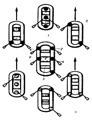 Рис. 2. Варианты размещения экипажа и груза в надувных лодках: а – в лодке типа НДЛ; б – в лодке типа ЛАС-3; в – в лодке типа ЛАС-5: 1 – лодка; 2 – гребец: 3 – груз; 4 – вёсла.