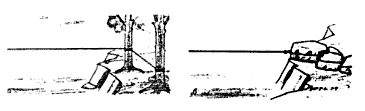 Зарисовку местности с натуры начинают с «привязки» будущей схемы к изображаемому участку. Для этого зрительно на уровне глаз намечают линию горизонта и гл. вертикаль (так, чтобы они проходили через характерные ориентиры, напр. одинокий куст или дерево на склоне, скальный выступ необычной формы, лавинный конус) и наносят их на лист бумаги (рис.). Затем на схему наносят все осн. ориентиры с соблюдением их взаимного расположения и относит. удаленности от линий горизонта и гл. вертикали. Относит. расстояния между ориентирами определяют при помощи карандаша или линейки. Зная длину руки, размер карандаша и примерные размеры ориентира (по описаниям, на основе зрительного сопоставления с предметами, размеры к-рых известны), можно вычислить расстояние до этого ориентира. Для расчетов можно принять: рост человека 1,75 м, высота столба линии связи 5 – 7 м, одноэтажного дома 7 – 8 м, средневозрастного леса 18 – 20 м, длина грузового автомобиля 5 – 6 м. Местность между ориентирами изображают на глаз, примерно так, как рисуют пейзаж, но более схематично. Иногда для уточнения ориентиры на схему наносят в виде условных значков: схема может также сопровождаться пояснениями и предварит. оценками сложности пути, описаниями опасных мест и т. п.
