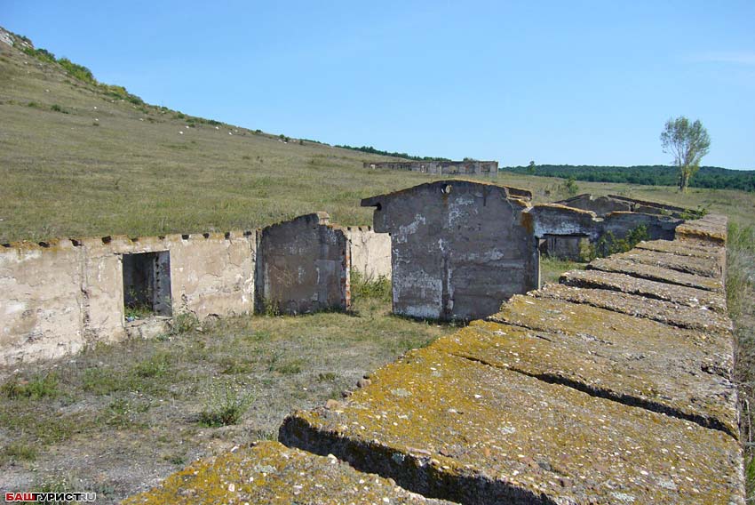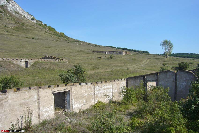 Если подойти к горе вплотную со стороны Салавата, то у подножия на фоне буйно разросшейся зелени рукотворными «дольменами», глядя на которые мурашки по коже бегут, стоят полуразрушенные бывшие железобетонные ящики-бараки. В конце 40-х — начале 50-х годов здесь располагался лагерь сталинского ГУЛАГа, куда попадали заключенные за особо опасные преступления. Стены в метр толщиной сейчас почти ушли в землю, нет и двухъярусных железобетонных нар, многочисленные карцеры — каменные сундуки заросли травой. Крышу, двери и окна, из проемов которых торчит в палец толщиной срезанная арматура, видно, растащил деревенский люд на свои нужды. Не осталось следов и от забора из колючей проволоки. Но еще можно разглядеть место большой плиты-стола, к которой заключенных приковывали цепями и на глазах у всех жестоко наказывали. Каждый день в лагере рыли могилу, в которую сбрасывали десятки трупов. В секретную зону никогда не приходили письма и посылки, не разрешались свидания. Говорят, что конвоиры подбирались не из местных, по особым качествам, и были в основном из охранников лагерей строгого режима Сибири и Дальнего Востока.