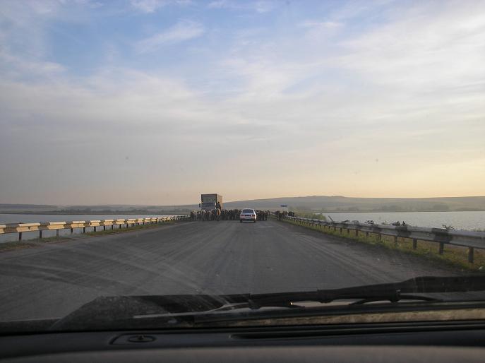 Она как обычно в отличном состоянии, оценка пять. Перед платиной Верхнеуральского водохранилища сворачиваем на лево, на Верхнеуральск. Дальше дорога похуже, но сносного качества, четыре с минусом - четыре. За Спасском на мосту через Урал утыкаемся в стадо коров.