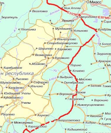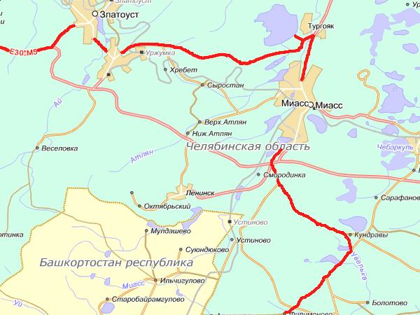 Из европейского Златоуста в азиатский Миасс направляемся по дороге расположенной немножко севернее трассы М5. Она очень хорошего качества (твердая 5), и гораздо менее загружена.
