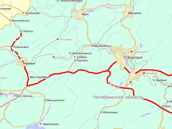 Останавливаемся у заправки перед поворотом на Бердяуш, ждем нашего незадачливого напарника. Далее сворачиваем с М5 на право на Бердяуш, и движемся до него по очень извилистой, но хорошей дороге. Проехав через весь поселок насквозь, попадаем на насыпную дорогу, и сразу же начинается серпантинный спуск. Вопреки рассказам и отчетам насыпная дорога от Бердяуша вполне хорошего качества, очевидно, что ее успели разровнять. Вполне можно ехать со скоростью 80 км/час.