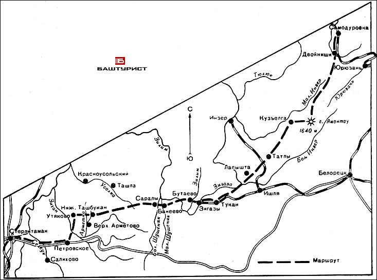 Цифры в скобках – приблизительное расстояние от ст. Юрюзань ЯМАНТАУ, наиболее высокий горный массив Юж. Урала, в Башкирии. Высота 1640 м. На склонах — смешанные леса. крупный массив с двумя вершинами- Большой (1640) и Малой (1519). Они соединены широкой седловиной на высоте 1300 метров. Поход начинается от железнодорожной станции Юрюзань, стоящей на узкоколейке (не путать с городом Юрюзань Челябинской области). От станции туристы идут к юго-западу вдоль реки Юрюзань, текущей среди горных хребтов Машак на западе и Кумердак на востоке. В полукилометре от станции долина реки имеет вид ущелья. Здесь Юрюзань с шумом пробивается среди крупных глыб, заваливших ее русло. Местные жители называют это место "Шумы". Вода в реке чистая, прозрачная. Берега высокие, покрытые преимущественно хвойным лесом (ель, пихта), но много лиственных деревьев, ягод (земляника, малина). Примерно через 3 часа туристы подходят к поляне, где некогда была деревня Круглое. Деревни давно уже нет, и только заросли крапивы указывают, что здесь раньше стояли дома. За деревней берега Юрюзани делаются ниже, появляются болота, среди которых реку не всегда можно найти.