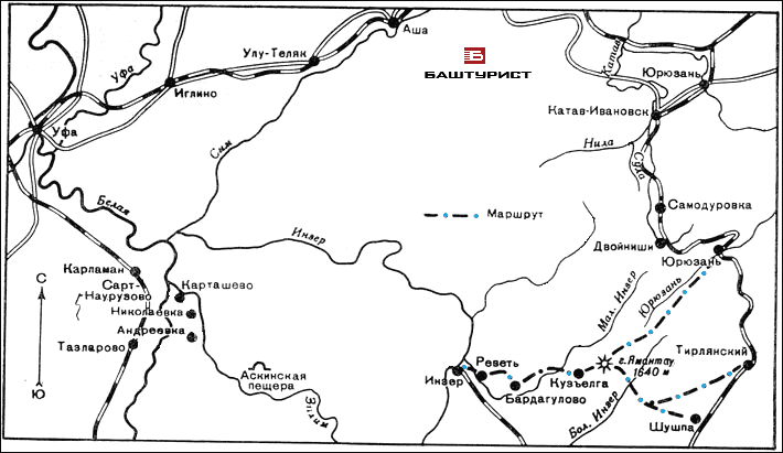 На Кузъелгу. С седловины горы, взяв азимут 270°, туристы спускаются к долине реки Малый Инзер и через несколько километров выходят на дорогу, ведущую к селу Кузъелга (около 95 км), проходят деревни Бардагулово (около 120 км) и Реветь (около 135 км). При желании кончить поход в Инзере из этого поселка по узкоколейке можно приехать в Белорецк. Можно продолжить маршрут до Уфы водой. В этом случае необходимо выяснить (например, в сельсовете), насколько высоко стоит вода в реке Инзер и насколько проходим перекат Сарышта. Если вода достаточно высокая, нужно ехать до станции Курманяй, в селе Запань (2 км от станции) купить лодку и на ней плыть по Инзеру, Симу, Белой до села Охлебинино вниз. Если же из-за низкой воды Сарышта непроходим, следует идти вдоль берега реки вниз по течению и в лесобирже Бриштамак (ниже села Ассы) приобрести бревна для плота, на котором сплавиться до Охлебинино (см. маршрут "Река Инзер").