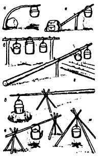 Рис. 8. Примеры размещения варочной посуды на костре с использованием подручных материалов.