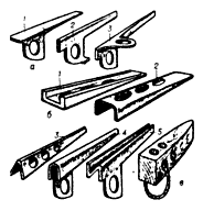 Рис. 1. Скальные крючья: в – лепестковые (7 – горизонтальный, 2 – вертикальный, 3 – универсальный): б – профильные (1 – швеллерный, 2 – коробчатый, 3 – 5 – A-, U- и N-обазные); в – деревянный клин.