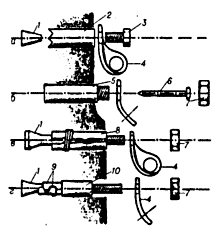 Рис. 3. Шлямбурные крючья: а – самоврезной конусный; б – дюбельный; в –цанговый; г– разъемно - втулочный; 1 – конус; 2 – шлямбур (тело крюка); З – винт; 4 – фурнитура; 5 – дюбель; 6 – костыль; 7 – гайка; 8 – цанга; 9 – разъемная втулка; 70 – трубка (тело крюка).