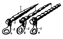 Рис. 4. Ледовые крючья: а – классический тип («морковка ); б – штопор; в – ледобур («трубка»). 1 – тело крюка; 2 – гайка: 3 – фурнитура.