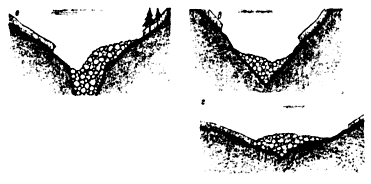 Степень лавиноопасности долин различного поперечного профиля: а – условно безопасная (широкая долина с пологими склонами, покрытыми лесом или кустарником, возможен сход мокрых лавин и снежных селей после долгих дождей); б – относительно безопасная (корытообразная долина со ступенчатыми склонами средней крутизны 25 – 500, покрытыми редким лесом, возможен сход локальных лавин); в – лавиноопасная (корытообразная долина со склонами крутизной 45 – 500, безлесными или покрытыми молодым лесом и кустарником); г – лавиноопасная (корытообразная долина с безлесными склонами крутизной свыше 150); д – очень лавиноопасная (V-образная долина с безлесными склонами крутизной более 450); е – очень лавиноопасная (корытообразная или V- образная долина с каньоном)