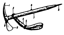 Рис. 1. Ледоруб: 1 – «клюв»; 2 – лопатка; 3 – кольцо, 4 – темляк; 5 – антапка; 6 – ограничитель; 7 – рукоятка (древко); 8 – штычок, 9 – отверстие для страховки.